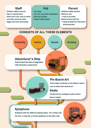 Through "Life-size snake and ladder", we learnt that kids love free-play and dislike following rules. Through "Describe to illustrator" and "Play-doh", we gathered that imagination is really important in one's childhood, and are able to understand how wild and creative a child's mind can be without being restrained by logic and practicality. And we realized that we really want our concept to be that area where kids are able to unleash their imagination and creativity freely.
